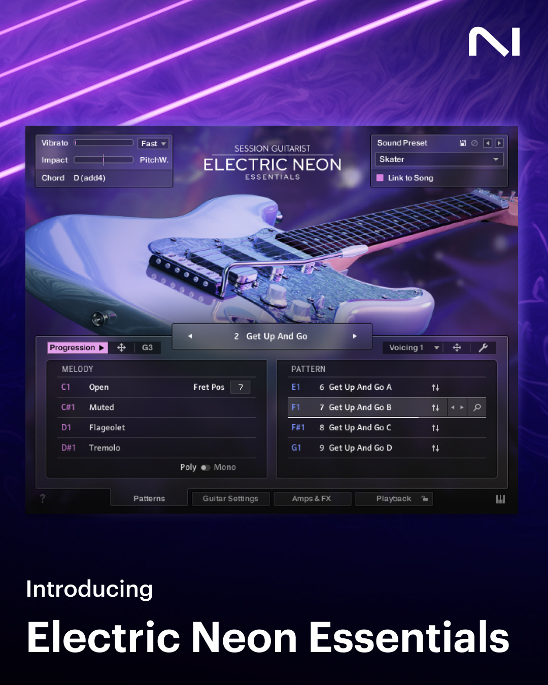 The instrument combines a pattern-based engine for tempo-synced rhythm parts with a melody mode for manually played lead lines. It also includes built-in effects chains, a range of articulations, and genre-specific presets. Everything runs inside Kontakt 8 with NKS integration.